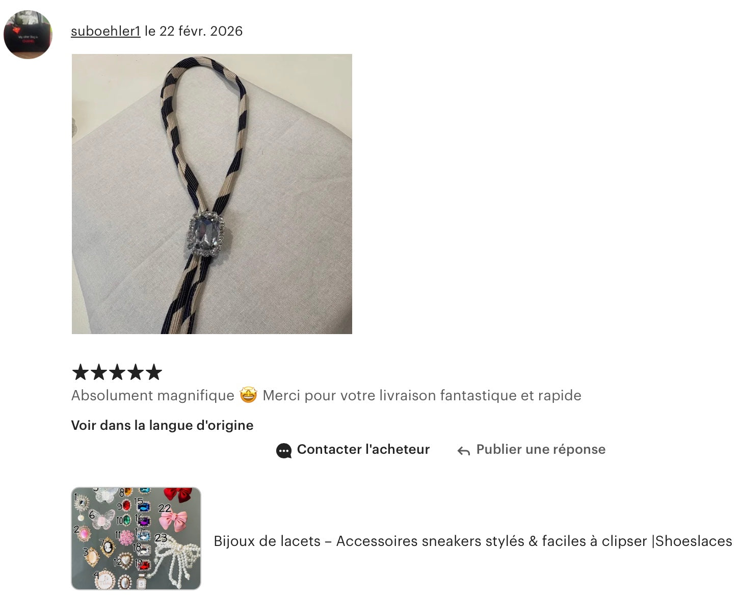 Chez Shoeslaces, chaque détail compte — et ça commence par la qualité.On sélectionne chaque style à la main, certains sont même faits maison. Tu mérites ce qu’il y a de mieux, sans compromis.Ta commande ? Préparée et expédiée sous 48h en lettre suivie.Ton expérience ? Elle doit être simple, cool, et carrément agréable. Et si t’as la moindre question, on est là — vraiment là. Shoeslaces, c’est du style, mais aussi du soin.